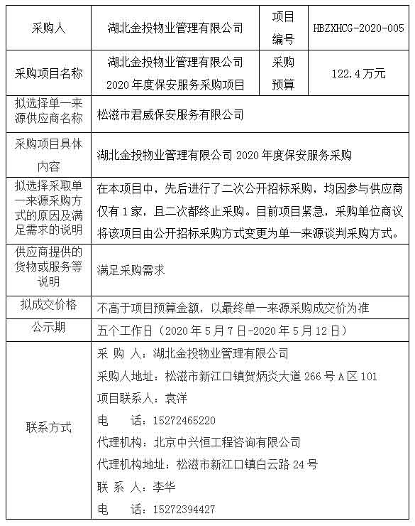 湖北金投物業(yè)管理有限公司2020年度保安服務(wù)采購《擬采用單一來源采購方式公告》
