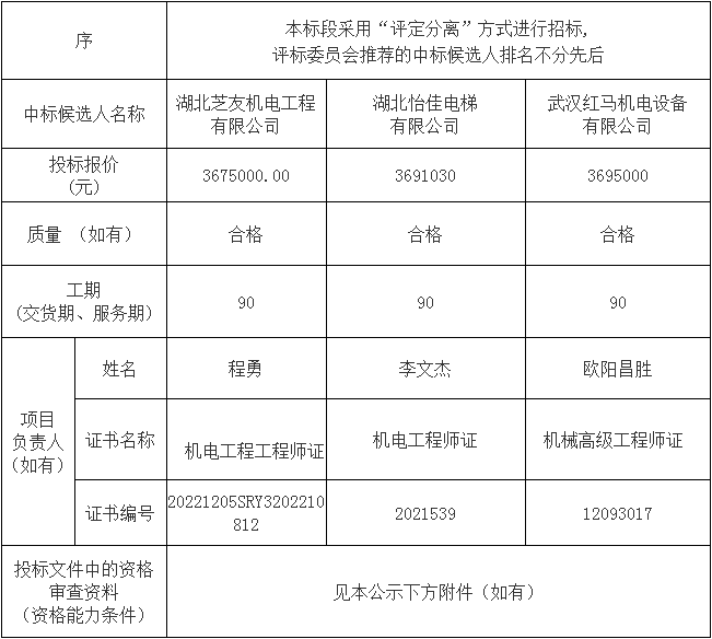 金投?新城臻品金投?新城臻品建設(shè)項(xiàng)目電梯設(shè)備采購安裝項(xiàng)目于2024年01月10日在湖北省電子招投標(biāo)交易平臺(tái)發(fā)布招標(biāo)公告,2024年01月31日在松滋市開標(biāo)室(2)開標(biāo),并于2024年01月31日完成評(píng)標(biāo)工作。根據(jù)評(píng)標(biāo)委員會(huì)提交的評(píng)標(biāo)報(bào)告,湖北松滋金投置業(yè)有限公司已經(jīng)確認(rèn)評(píng)標(biāo)結(jié)果,現(xiàn)進(jìn)行評(píng)標(biāo)結(jié)果公示。