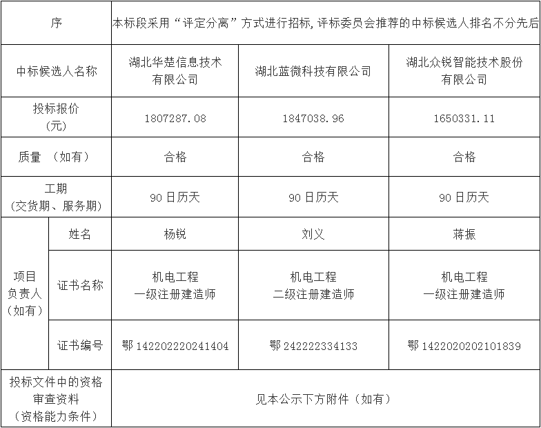 金投?新城臻品金投?新城臻品建設(shè)項(xiàng)目弱電智能化工程于2024年01月26日在湖北省電子招投標(biāo)交易平臺(tái)發(fā)布招標(biāo)公告,2024年02月27日在松滋市開標(biāo)室(2)開標(biāo),并于2024年02月27日完成評(píng)標(biāo)工作。根據(jù)評(píng)標(biāo)委員會(huì)提交的評(píng)標(biāo)報(bào)告,湖北松滋金投置業(yè)有限公司已經(jīng)確認(rèn)評(píng)標(biāo)結(jié)果,現(xiàn)進(jìn)行評(píng)標(biāo)結(jié)果公示。