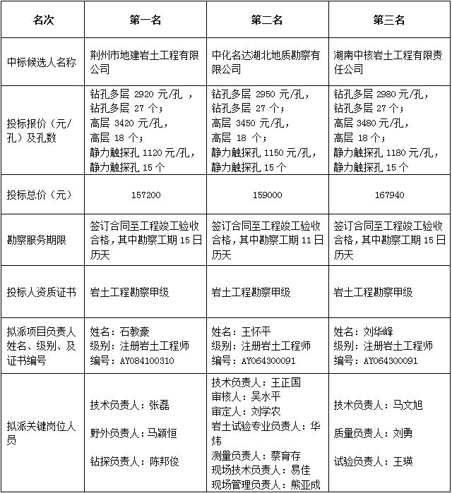 松滋市人才公寓建設(shè)項(xiàng)目勘察于2018年12月29日在松滋金投商業(yè)開發(fā)有限公司發(fā)布投標(biāo)邀請(qǐng)書,2019年1月5日在松滋市金松集團(tuán)開評(píng)標(biāo)室開標(biāo)。根據(jù)評(píng)標(biāo)委員會(huì)提交的報(bào)告,松滋金投商業(yè)開發(fā)有限公司已經(jīng)確認(rèn)開標(biāo)結(jié)果,現(xiàn)進(jìn)行中標(biāo)候選人公示。