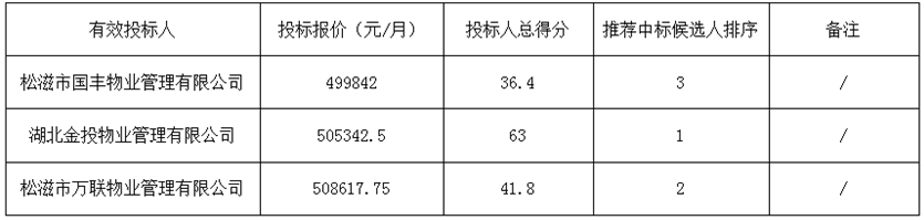 金投•新城壹品前期物業(yè)服務(wù)項(xiàng)目于2019年08月03日在松滋新聞網(wǎng)(網(wǎng)址:http://www.songzinews.net)(媒介名稱)上發(fā)布招標(biāo)公告,2019年09月12日在松滋市樂鄉(xiāng)凱瑞大酒店五樓會(huì)議室開標(biāo),并于2019年09月12日完成評(píng)標(biāo)工作。根據(jù)評(píng)標(biāo)委員會(huì)提交的評(píng)標(biāo)報(bào)告,湖北松滋金投置業(yè)有限公司已經(jīng)確認(rèn)評(píng)標(biāo)結(jié)果,現(xiàn)進(jìn)行評(píng)標(biāo)結(jié)果公示。